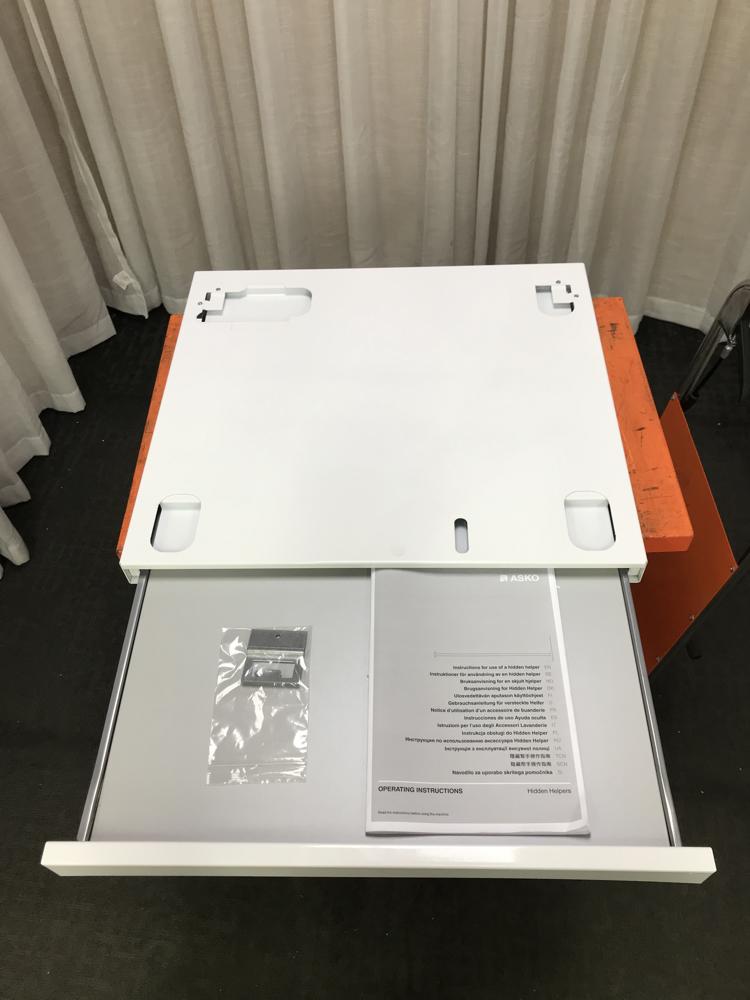 Pull-out shelf for laundry HSS1053W Pull-out shelf can be used as an additional surface space when folding clothes and sorting socks - or for storage. Now that’s practical! NEW WHITE PULL OUT SHELF HSS1053W ONLY SUITS W2084C W4086C W4086PW T208C T208H T408HD ALL 8KG MODELS ONLY THIS CANNOT BE USED WITH ANY TEN KILO MACHINE PLEASE CALL PLEASE CALL 1300002756 OPTION 2 BEFORE ORDERING IF UNSURE, RECOMMENDED TO BE INSTALLED BY ASKO DIMENSIONS (HxWxD)4,8 × 59,5 × 56,5 cm