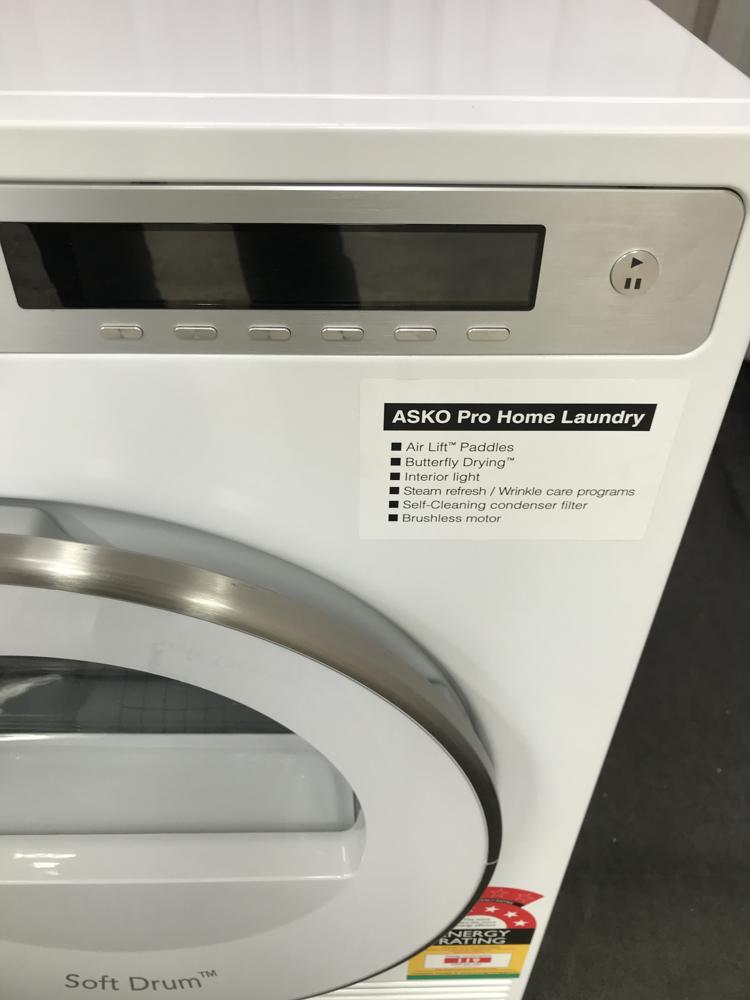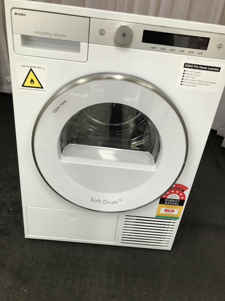 2 YEAR WARRANTY ON ALL APPLIANCES, EXTENDED WARRANTY NOT AVAILABLE. INSTALL FOR EXTRA $99, INCLUDES REMOVAL OF OLD MACHINE. FREE METRO DELIVERY!!! ASKO have 3 kinds of Dryers, with unique technologies behind them: Heat Pump, Condenser and Vented. Heat Pump Dyers are closed systems in which the internal air circulates inside the machine- making them perfect for confined spaces. Furthermore, Heat Pump Dryers are not affected by warm or humid climates and effectively consume less power. Condenser Dryers have two parallel airflows- internal airflow where air is warmed up when passing through a heater and the drum, transporting moist air out. Moisture is evacuated either via a drain or in the water tank. Vented Dryers take in external air that runs through the drum with the humid air extracted. Vented Dryers require good airflow wherever placed. Tumble dryer T608HX.W.AU Capacity: 8 kg Heat pump Number of programmes: 18 Auto condenser filter cleaning Installation: Freestanding Range: Style Energy stars: 8 Colour of the product: White The heat pump dryer consumes only 0.24 kWh/kilo laundry. This combined with the Sensi Dry™ system and the Auto programs makes ASKO a good option for the environmental conscience customer Construction and performance Inner drum Stainless Steel Motor Long life and quiet brushless motor Heating system Heat pump Drying types Sensor or time controlled Drum size 117 l Easy to use lint filter Yes Dimensions Width 595 mm Height 850 mm Depth 654 mm Depth with door open 1165 mm Length of electrical cord 2100 mm Interaction and control Remaining time indication Yes Type of display LCD (TFT colour) Indication when program is ready Yes