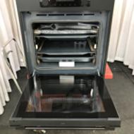 Oven OP8637A1 This Pyrolytic Self Clean™ oven in graphite black takes time off cleaning and adds to what is essential in the kitchen: cooking. The pyrolytic function incinerates any grease and oil residue inside your oven. You can then simply swipe off the remaining ash. The oven is fitted with an LCD display and endless cooking opportunities. Construction & Performance • Maximum oven temperature: 275 °C • Meat probe Use & Flexibility • Oven lighting: Both sides • Oven useful volume (old energy label): 71 l • OpenView • Fully extendible guides • 1x wire guides • One level fully extendable telescopic guides • Grid • 1 deep tray • 2 shallow trays Interaction & Control • Knob shape: Ergonomical dials • LED icons Programs, options and modes • Lower and upper heater • Small infra heater • Large Infra Heater • Large infra heater with ventilation • Circular heater • Lower heater and fan • Lower heater with fan BIO • Defrost cooker • WarmPlate • Fast Preheat Design & Integration • Door material: Stainless steel and glass • Available colour: Graphite Black • Touch Free Inox • Niche dimensions (HxWxD): 59 × 56 × 55 cm Safety & Maintenance • Dynamic oven cooling plus - DC+ • GentleClose door hinge • Removable flat oven inner door glass surface • Pyrolytic cleaning • Pyroproof side racks Technical data • Consumption in standby mode: 1 W • Energy class: A+ • Oven consumption (conventional operation): 1 kWh • Oven consumption (venting operation): 0,69 kWh • Energy consumption conventional oven (old energy label): 0,94 kWh • Energy consumption forced air assisted oven (old energy label): 0,9 kWh • Connection rating: 3400 W • Frequency: 50 Hz Dimensions • Product dimensions (HxWxD): 59,5 × 59,7 × 54,7 cm • Net weight: 43,1 kg Logistic information • Dimensions of packed product (HxWxD): 70 × 66 × 70 cm • Gross weight: 48,3 kg • Product code: 742127 • EAN code: 3838782681271 • Market: Domestic • Range: Craft