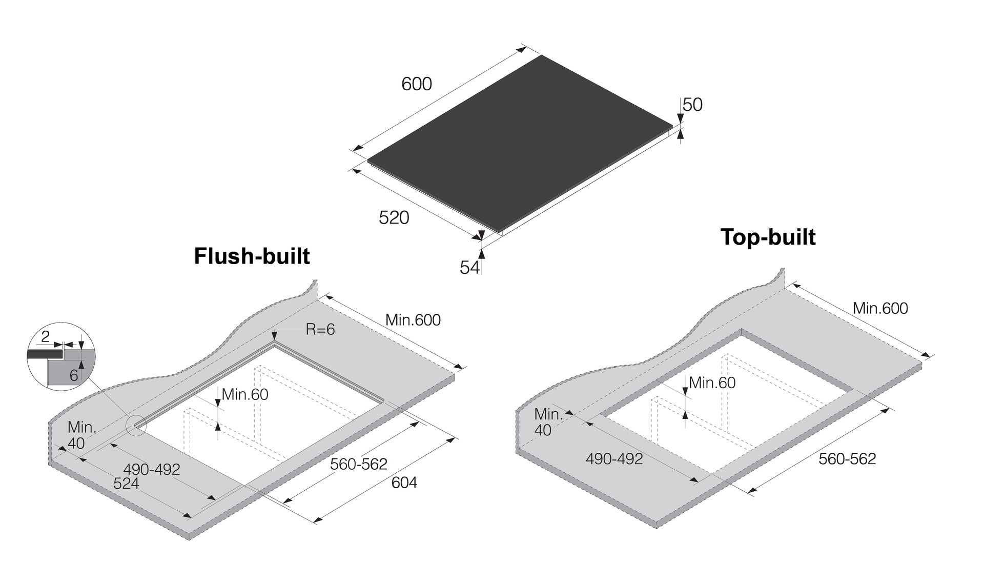 Design and integration • Edges: Soft cut edges • Min. niche width: 560 mm • Width of niche size for installation max.: 562 mm • Min. niche height: 70 mm • Depth (incl. wall spacing): 490 mm • Type of hob installation: Top & flush built-in installation